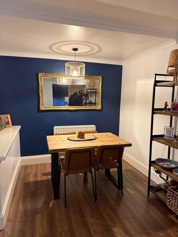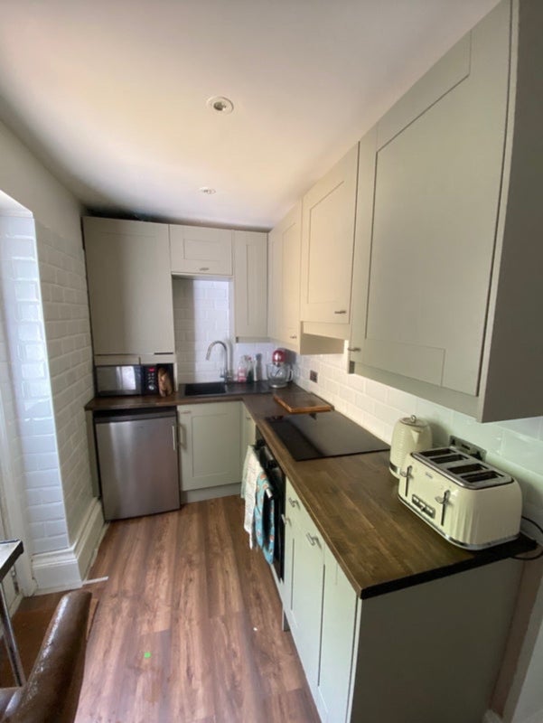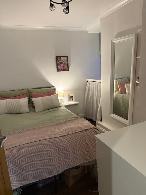 The room is a small double with a built in wardrobe and chest of drawers (and tons of space under the bed!), there’s a big sitting room with a dining area (great for hosting) and a new kitchen with a lot of storage!
