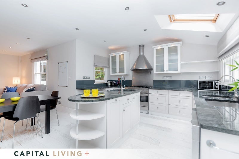 Open-plan kitchen, shared living spaces, and a lovely garden/patio.