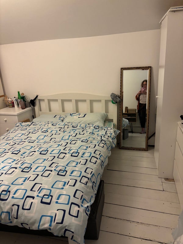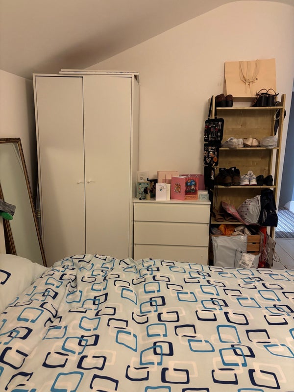 The room has a good sized wardrobe, chest of drawers, loads of shelving, a desk and wicker chair, a comfortable double bed and bedside table.