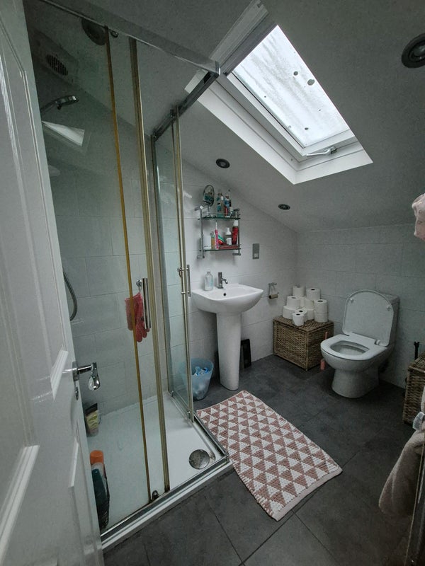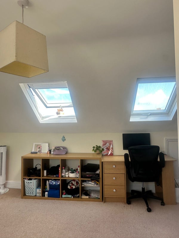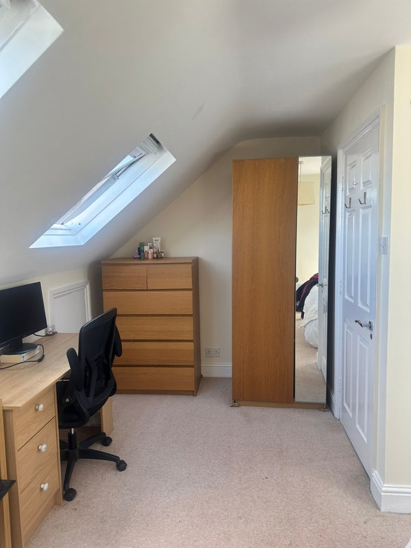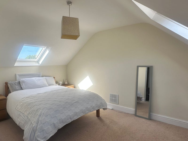 Each bedroom is on its own floor. The available room is a large double on the top floor with sky light widows. There's a double bed, chest of draws, 2 wardrobes and a desk in the room. You'll share a big bathroom with 1 other.