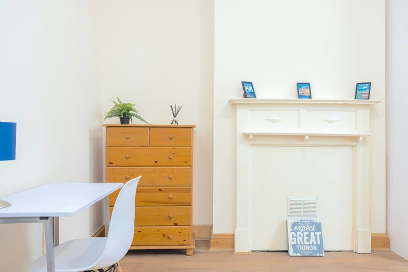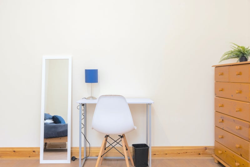 The room is furnished with a double bed, wardrobe, chest of drawers, bedside table, desk and chair