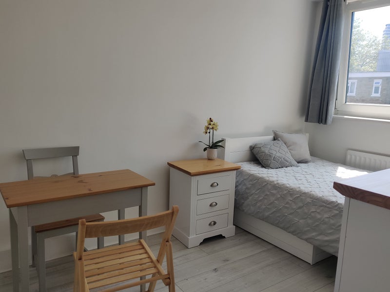 In the room there is a double 4'0 bed with a storage space, wardrobe, chest of drawers, small bed cupboard, desk/table and two chairs. The room is south facing so very bright:) There are blackout curtains so it will be helpful during a summer.