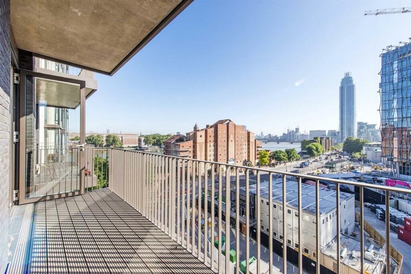 This apartment has an open plan reception room with a large balcony offering great river views towards the city and beyond.