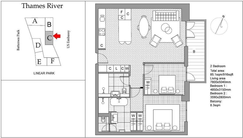 A spacious 2-bedroom apartment of approx. 916sq. ft (85.1sqm) in Ambassador Building, Embassy Gardens.