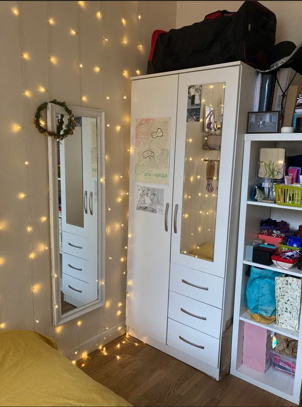 Double bed, wardrobe, shelves included.