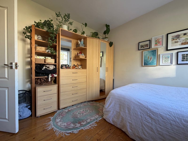 Largest room in the house overlooking the garden. Sunny room with queen bed, desk chest of drawers and built in wardrobe.