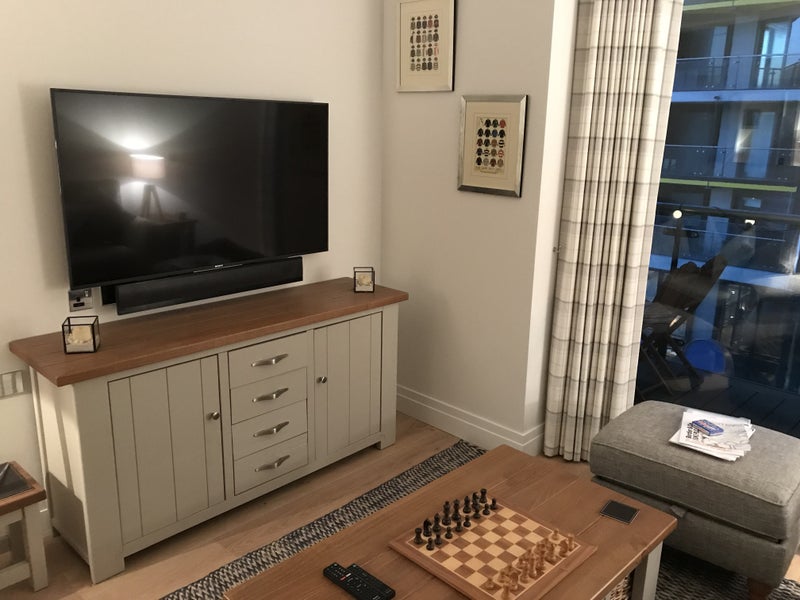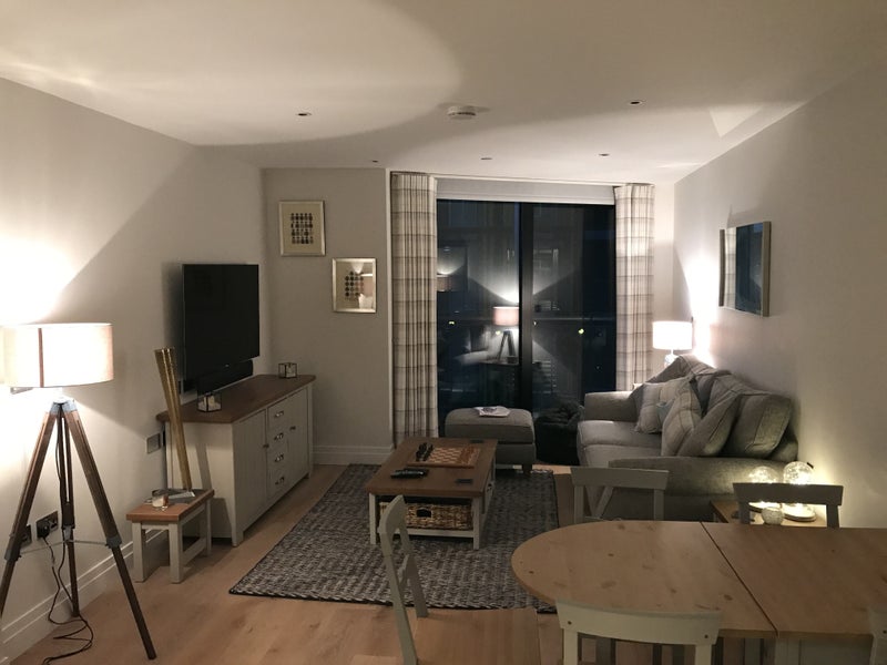 The flat has two bedrooms, two bathrooms and two balconies. The bedroom available has a double bed, flat screen TV on the wall with SKY HD TV and sliding doors onto the main balcony. The tenant will have sole use of the main bathroom. The bedroom has built in wardrobes with lots of storage.