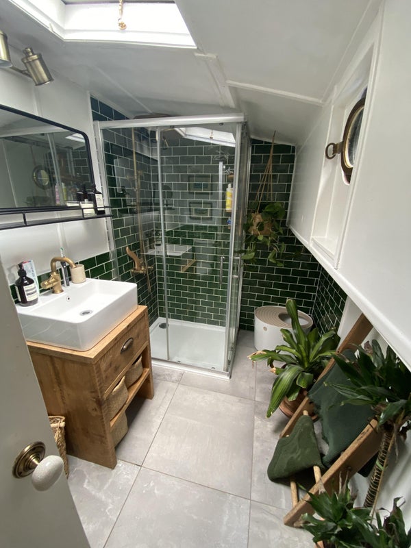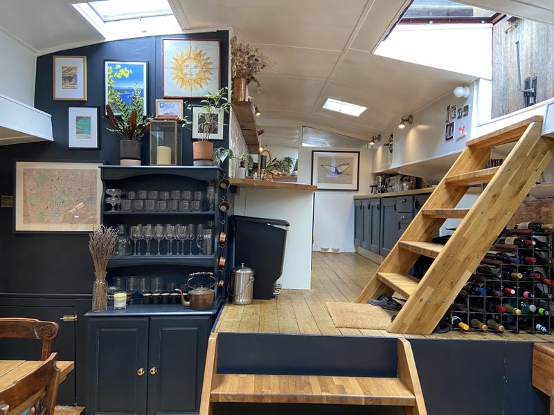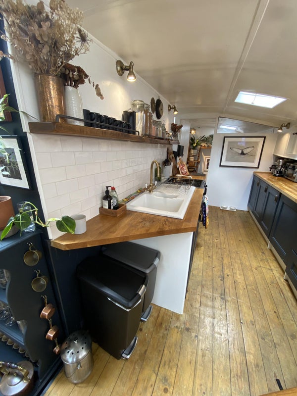 The boat has two bedrooms, one bathroom and ample storage. It has a large living space which features a wood burning stove, and a kitchen with fitted units.