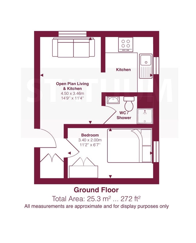 The flat features a bright open-plan living and kitchen area with modern appliances, a comfortable double bedroom, and a sleek shower room. The layout is smart and efficient, making the most of every inch of space (approx. 267 sq. ft).