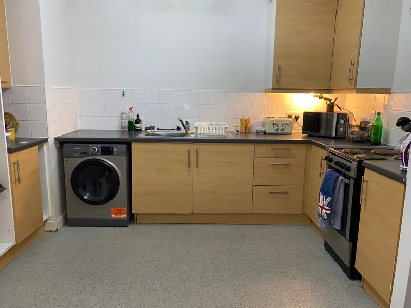 The flat has a large living area with a fully equipped kitchen, including washing machine, dryer, hob, oven and cooker.