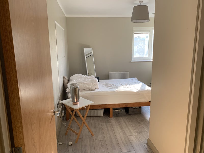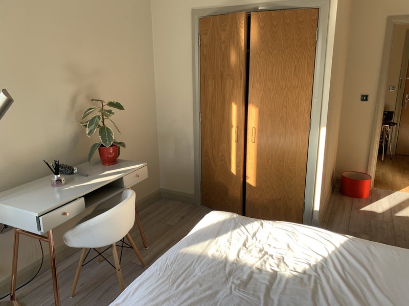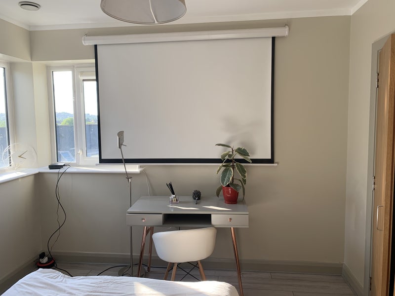 Available now an attractive contemporary pleasant 2-bed flat, with a huge sized double bedroom (16 metres squared) The room is light and airy south facing, with double-glazed windows and a built-in wardrobe. It also includes a brand new double bed with a high-quality double mattress, two bedside tables with lamps, a brand new desk and chair work area, and a 77-inch automatic projection screen for your own feature film nights. (An optional little projector is also available.)