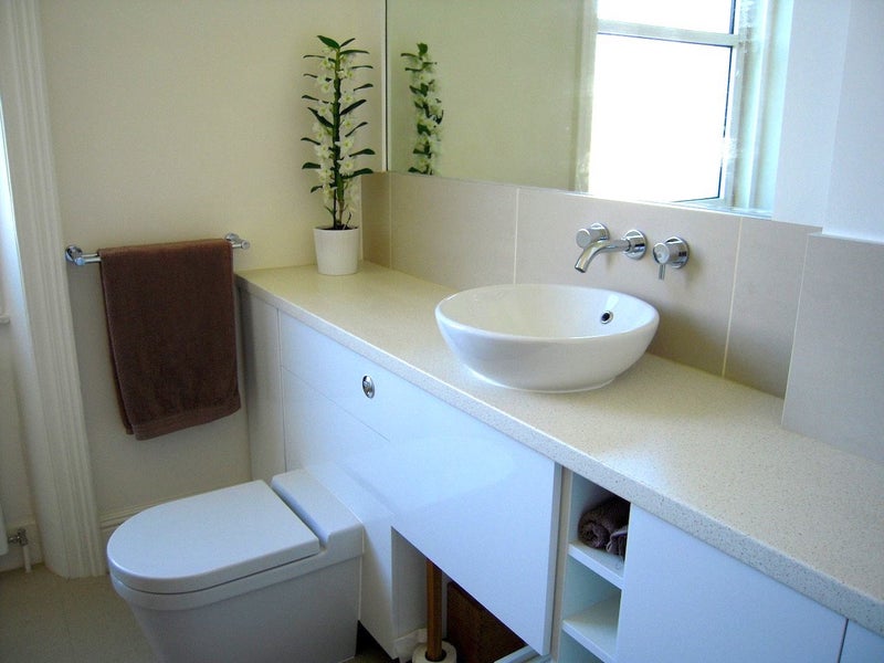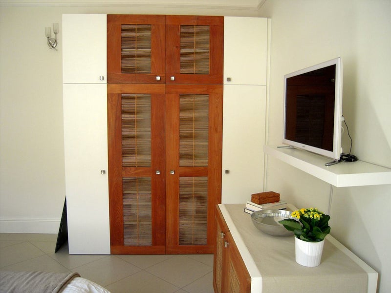 The bedroom furniture is custom made from fair trade teak and there is plenty of storage space in both the bedroom wardrobe / cupboards and new white bathroom units.