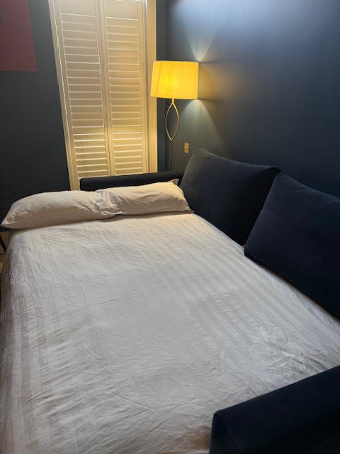 Brand-new, modern room (13’8 x 8’6) in a beautiful, leafy block. Features high-end fixtures and a comfortable double sofa bed. Includes exclusive use of a separate personal bathroom with shower.