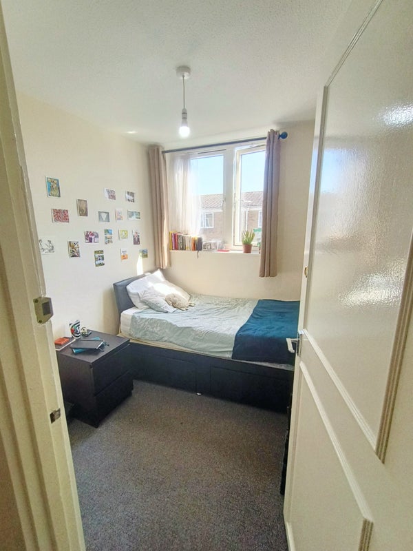The room is upstairs and comes furnished with a single bed, a wardrobe, a huge window with very good lighting overlooking neighbours’ gardens, mirrors and the sheets are provided. A cleaner will come fortnightly to clean the communal areas in the flat.
