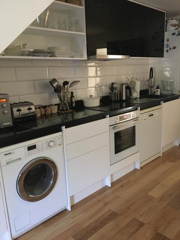 The kitchen has a washing machine with dryer, dishwasher, cooker, microwave and a large fridge.