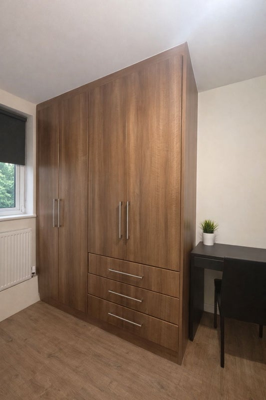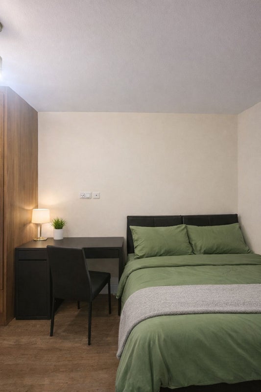 • Furnished for Comfort and Productivity: The room includes a double bed with storage, built-in wardrobes providing ample space for clothing, a desk, chair, full-length mirror, and USB sockets—ideal for professionals working from home or students engaged in study.