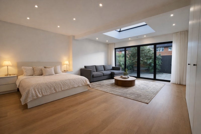 Exceptional ground-floor room with king-size storage bed, very large wardrobe, bifolding doors to a private garden, skylight, and plenty of natural light. Toilet and kitchen are just outside the room.