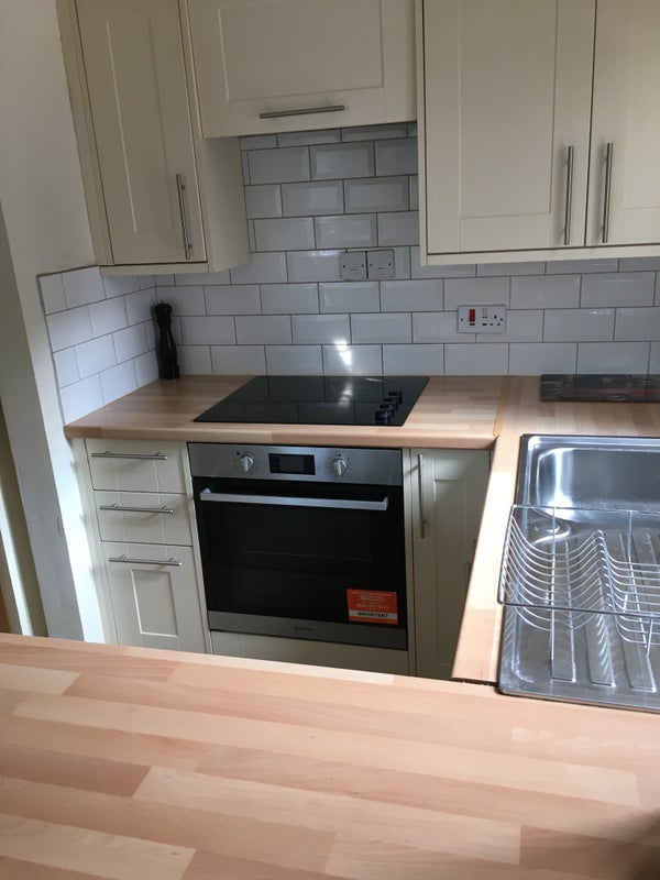 Kitchen. Electric hob, oven, fridge, washing machine, ample storage/cupboard space, sink, wooden flooring.