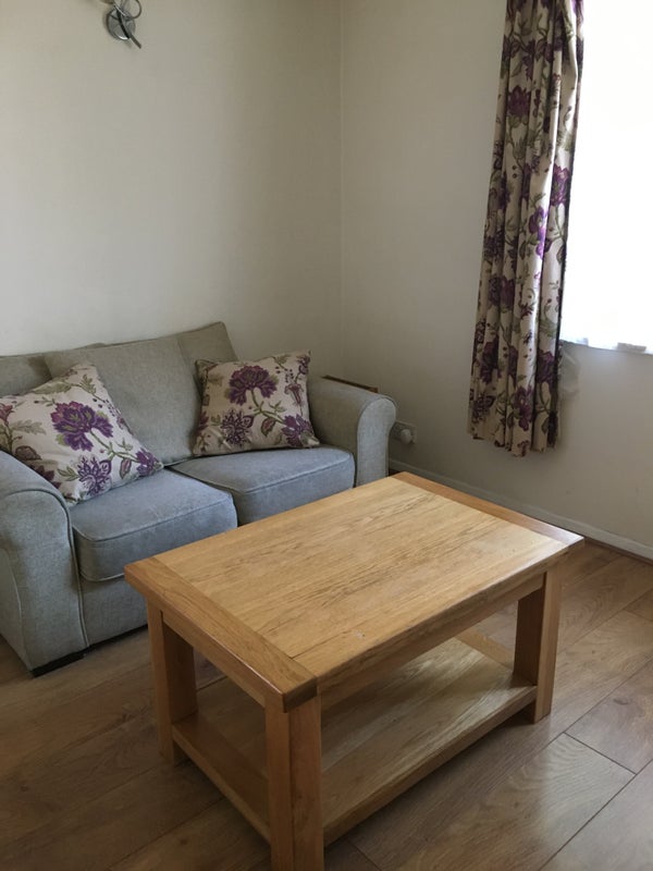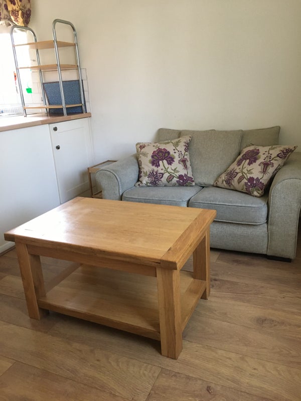 Large wooden floored reception room. Split between sitting and dining area: sofa, arm chair, centre table, dining table and 4 chairs, economy heating.