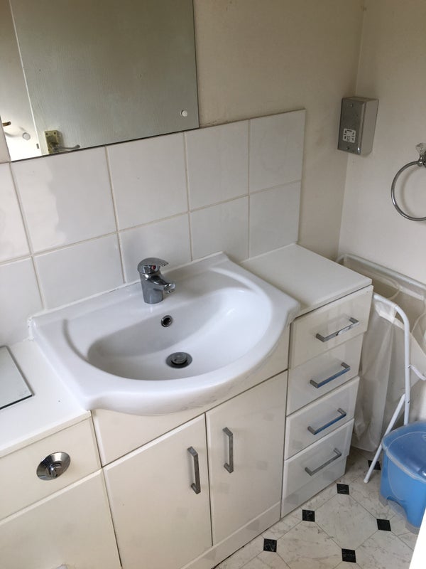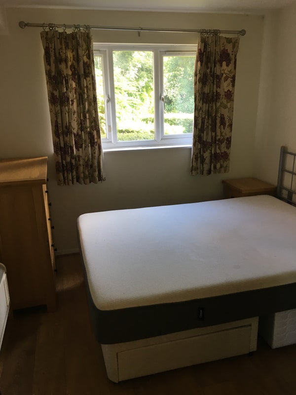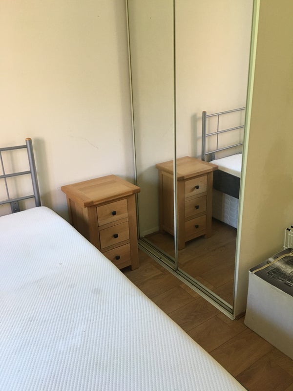 Bedroom 1: Double bed, fitted wardrobe and drawers, laminate flooring, electric heating, chest of drawers, bedside table.