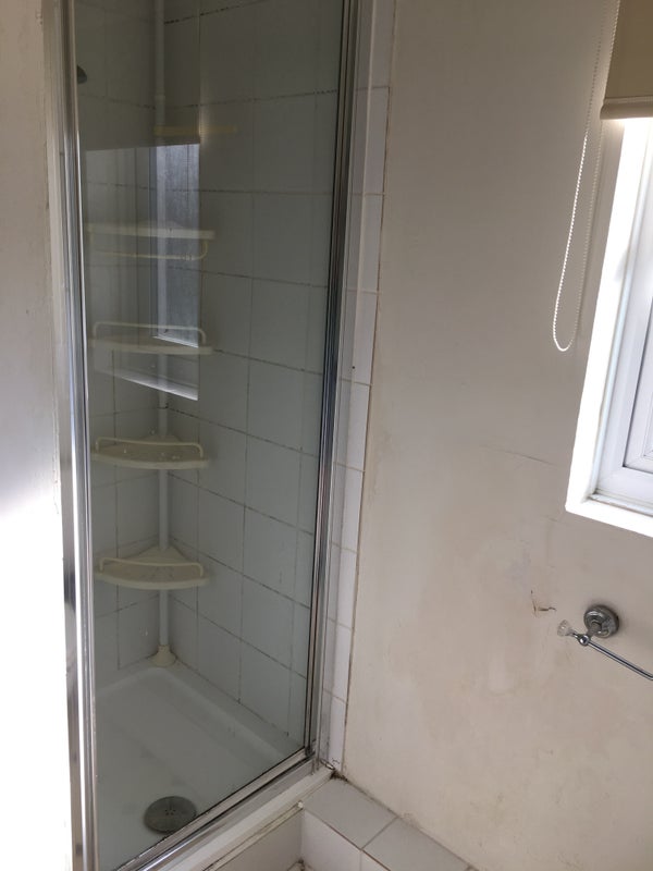Shower room. Electric shower, toilet and wash basin, wooden flooring.