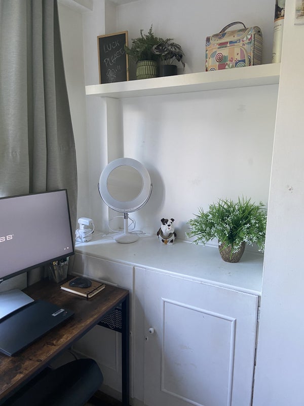 The room contains a double bed, bedside table, shelves, fitted mirror wardrobe, sofa, desk and chair.