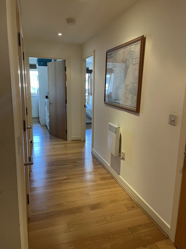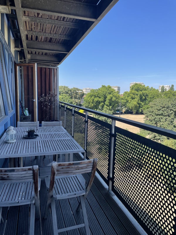 Spacious and nice two-bedroom flat close to Regent's Canal, with shared living room, kitchen, two bathrooms, and balcony facing Meath Crescent Gardens.