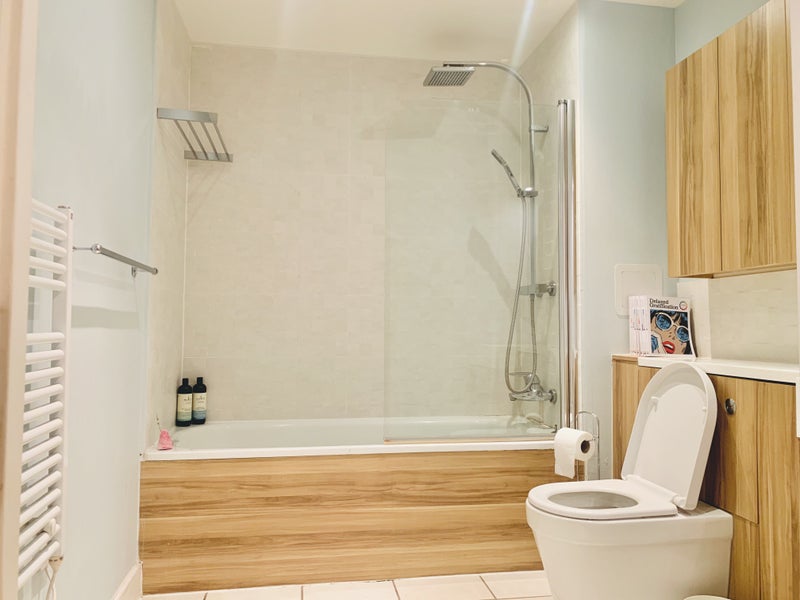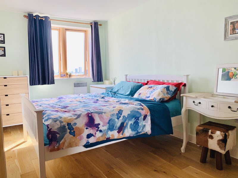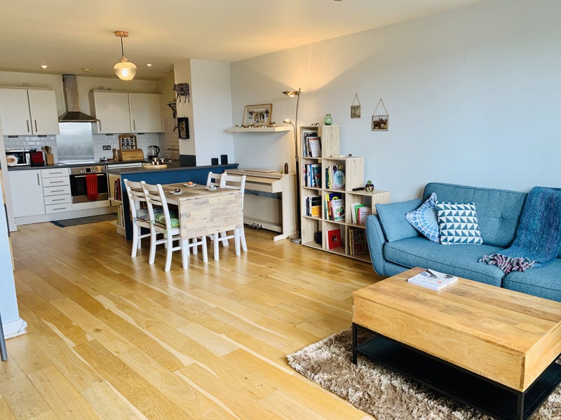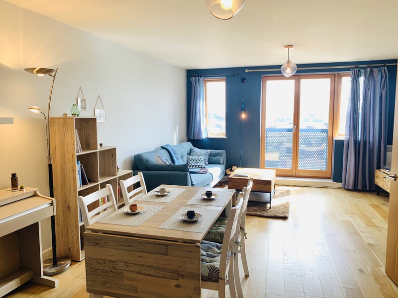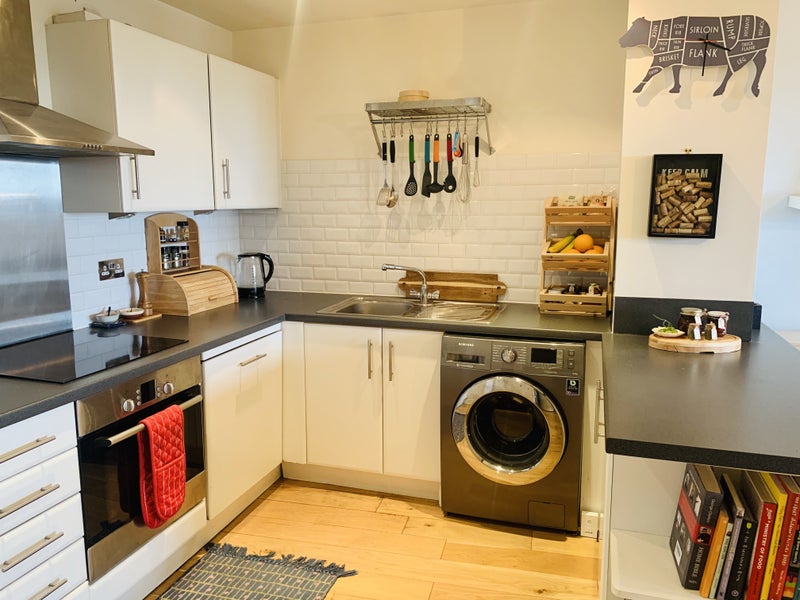 Benefitting from a Concierge service, 2 lifts, stairs and secure bicycle storage the flat comprises briefly: Hallway, storage cupboard, hot water tank storage cupboard, large contemporary family bathroom with rainbow shower over the bath, excellent storage room, one large double bedroom with built-in wardrobes and a welcoming open-plan kitchen-dining and living room with a Juliet balcony off the centre of the living room allowing for the double-glazed floor-to-ceiling French windows to be open on balmy Summer days. With a lovely modern kitchen, including a relatively new dishwasher and washing machine, microwave, toaster, kettle and blender thrown in (if desired), the heart of this home is this spacious open-plan living area.