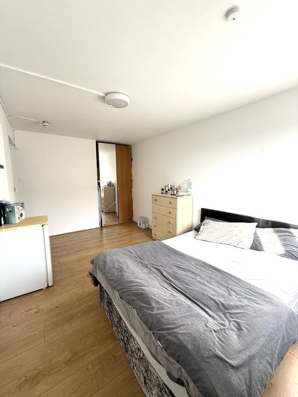 The room comes furnished with a double bed, wardrobe, and chest of drawers