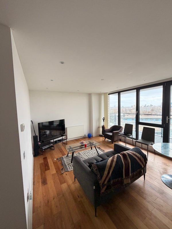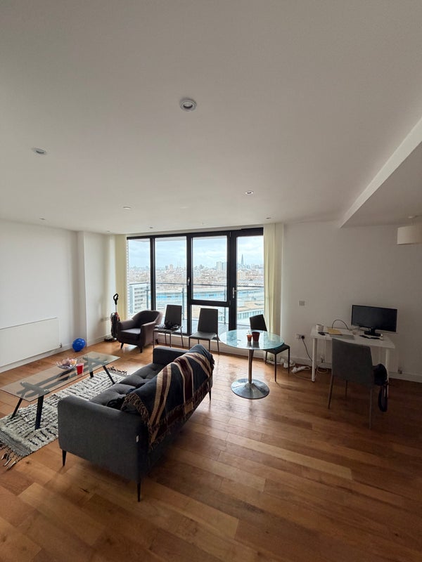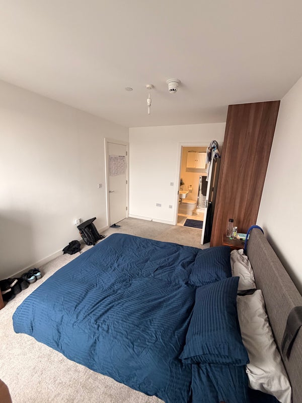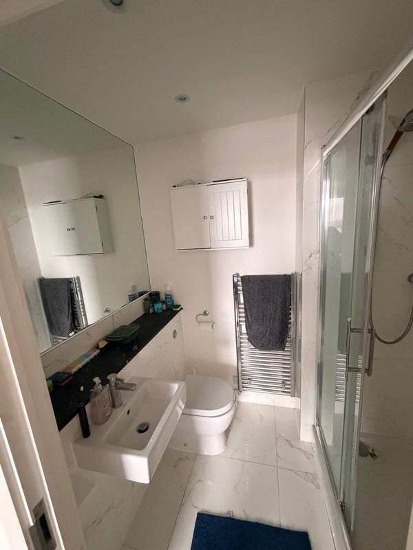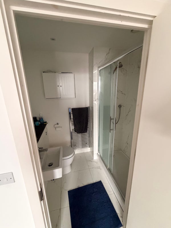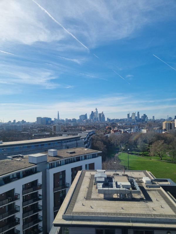 Bright and comfortable spare room available in Bethnal Green, featuring a double bed and private ensuite bathroom. The room has great views toward the City and Canary Wharf skyline.