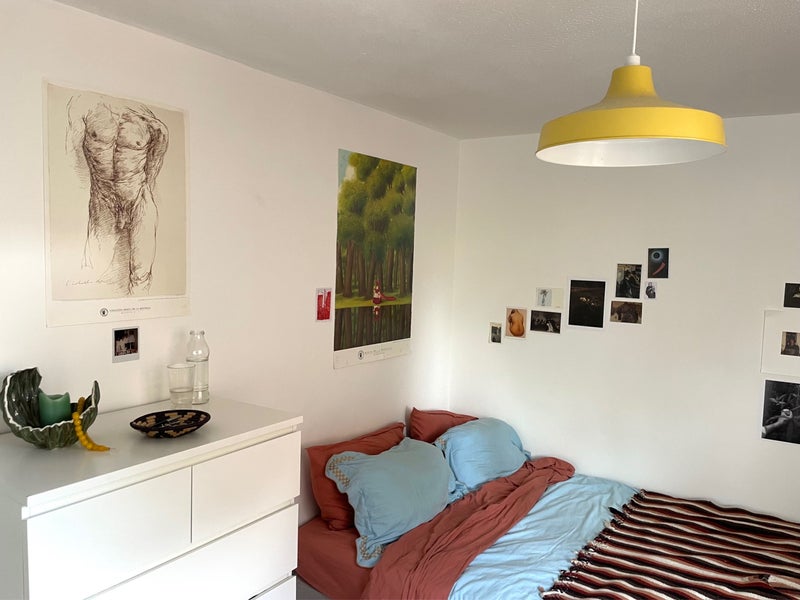 The room itself is quite large and bright, with a comfortable bed, big window, plenty of storage space (all of it will be emptied out for you) — you can really make yourself at home here🪴 The house has 1.5 bathrooms shared among the four housemates, a lovely large kitchen/living area, and a back patio!