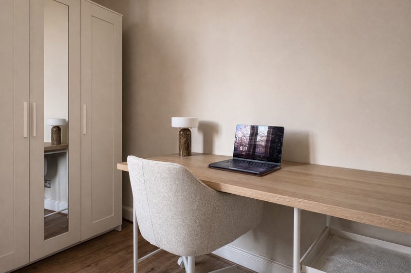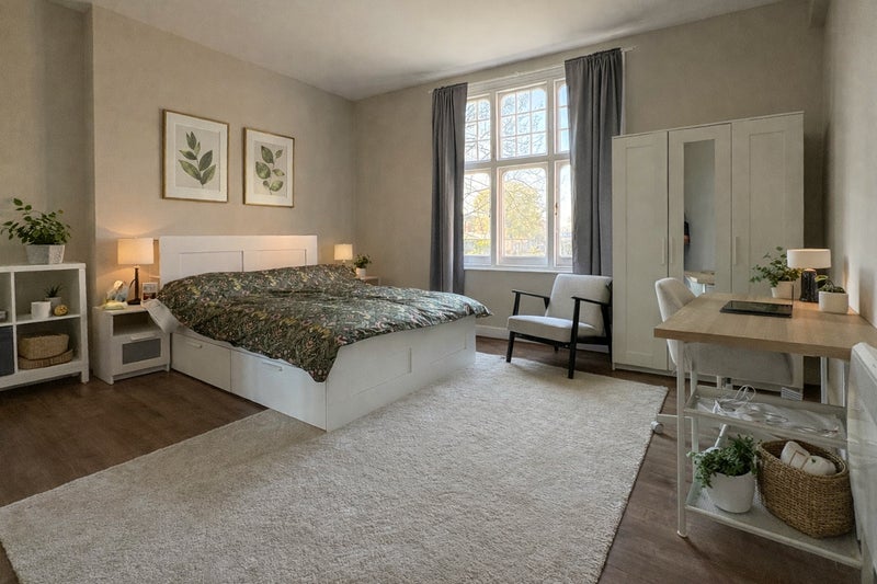 Each private room features a double or king-size bed, spacious double or triple wardrobes, a dedicated workspace with desk and chair, bedside tables, chest of drawers, and a comfortable lounge chair, creating a space that feels more boutique hotel than shared living.