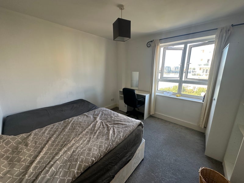 A large double furnished bedroom overlooking the River Thames through the large windows on two sides of the room. There is a wardrobe, chair and bedside cabinet presently. The room, along with the whole apartment, has recently been redecorated with brand new carpet and has been newly painted.