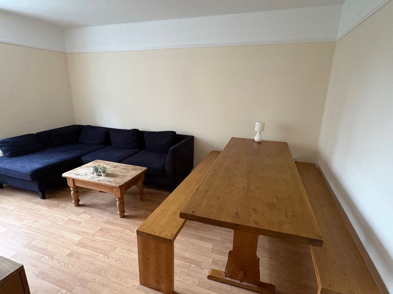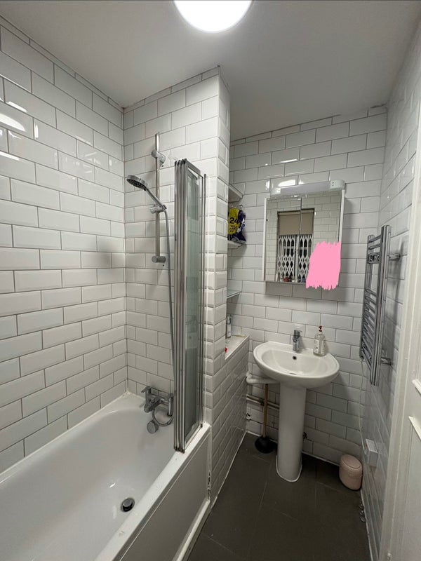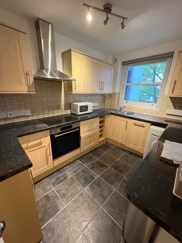 The flat is fab, with a lovely big living room that gets loads of natural light with a big sofa and massive dining table, perfect for hosting dinner parties! Plus the kitchen has a dishwasher and there is outdoor space to enjoy around the building.