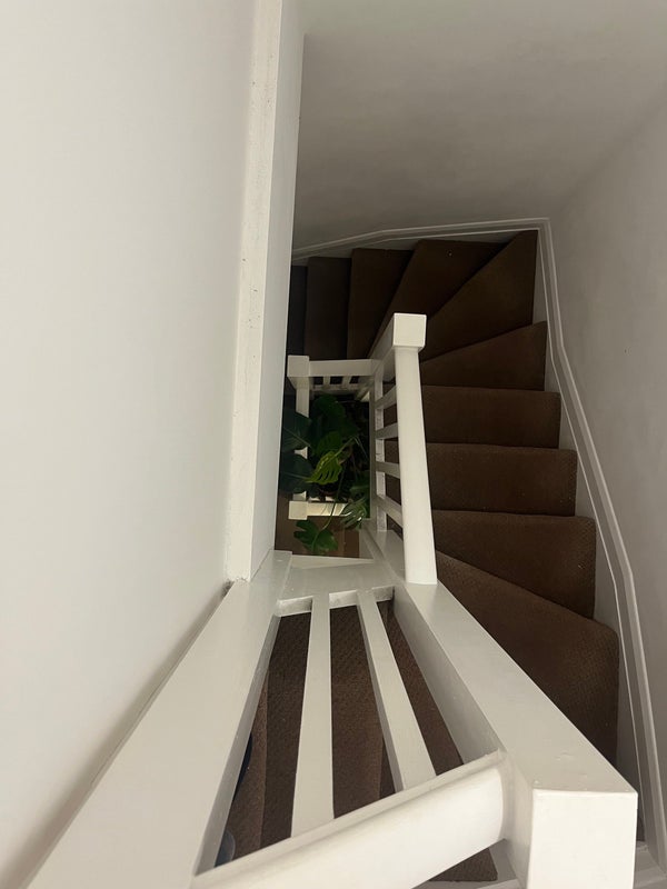 The flat is split level, with kitchen/living on the first floor, and the available room on the third floor. It’s got a semi-private entrance directly into the room.