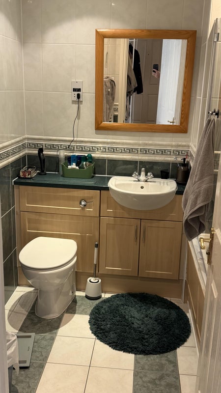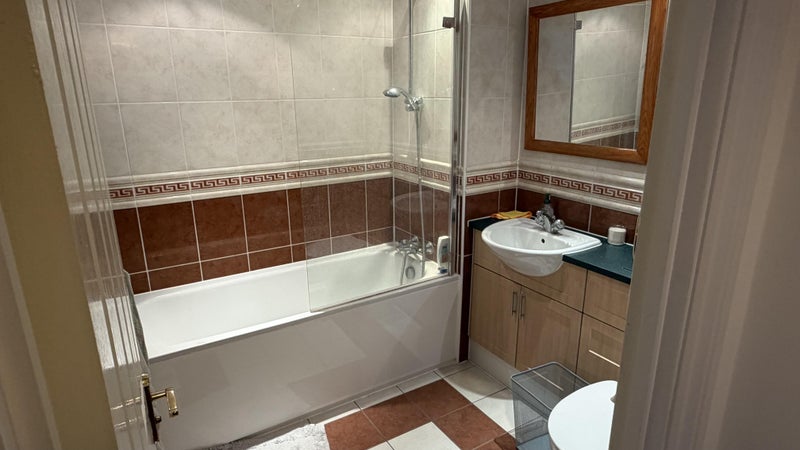 A good-sized double room with a double bed (under-bed storage), wardrobe, and clothes rail. Good natural light, laminate flooring, plenty of space. Own bathroom just off the hallway – full bath with shower over it, vanity sink with storage, and toilet.