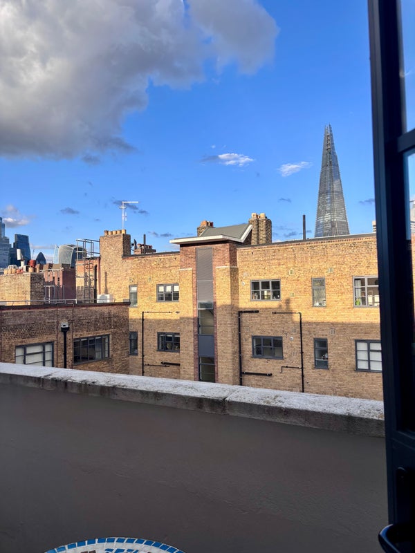 The flat is on the 4th floor (no lift) and has a shared bathroom, as well as a kitchen and living room. There’s also a balcony with views of the Shard and the City skyline.