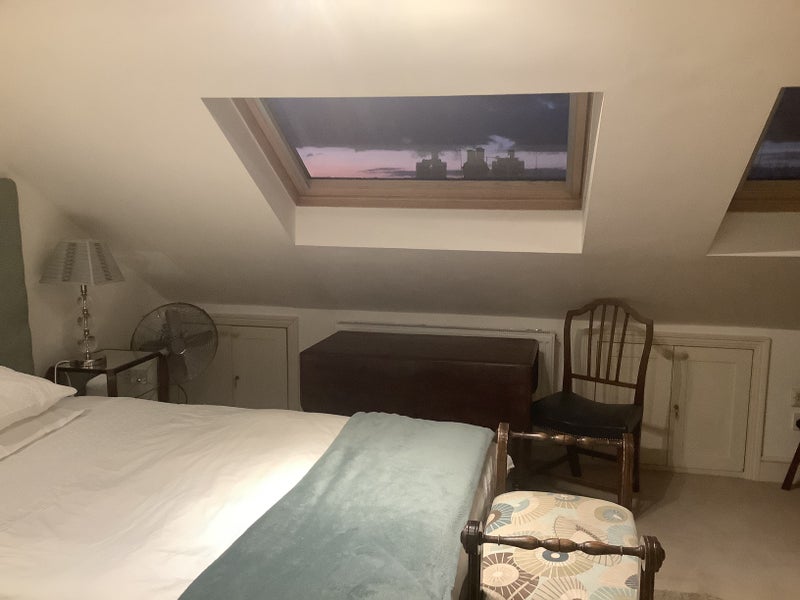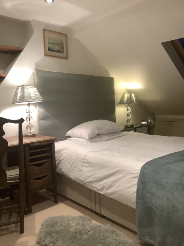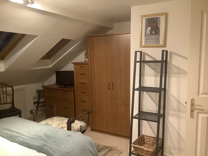 Furnished Double Loft Bedroom with Ensuite, double bed with drawers being let for single professional person complete with wardrobe, two chest of drawers, desk and chair, alcove bookcase, T. V. and broadband.. Black-out blinds to velux windows.