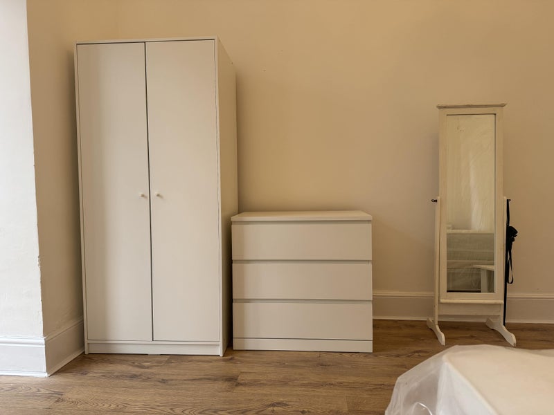 The room has been freshly painted and has a brand new luxury double bed with drawers, new Ikea wardrobe, chest of drawers and desk.