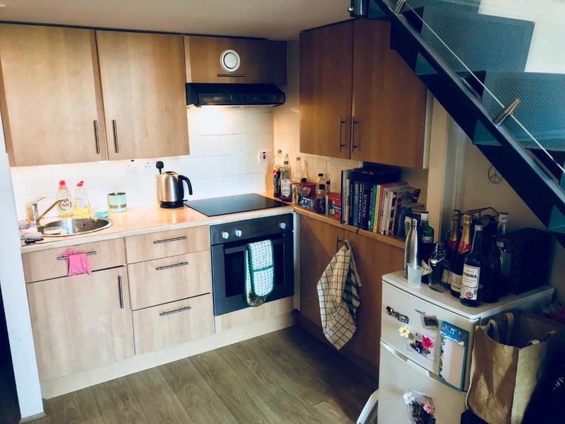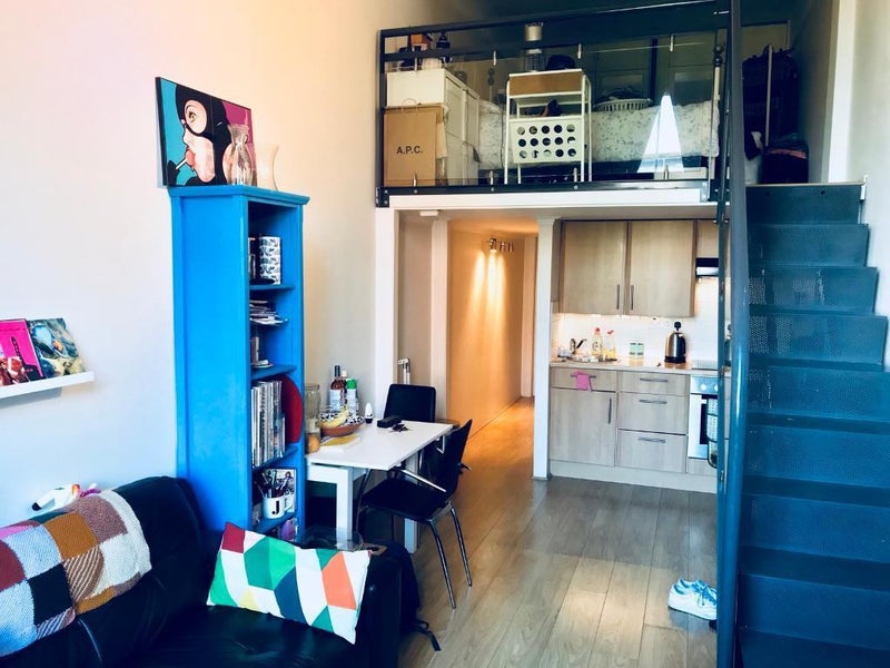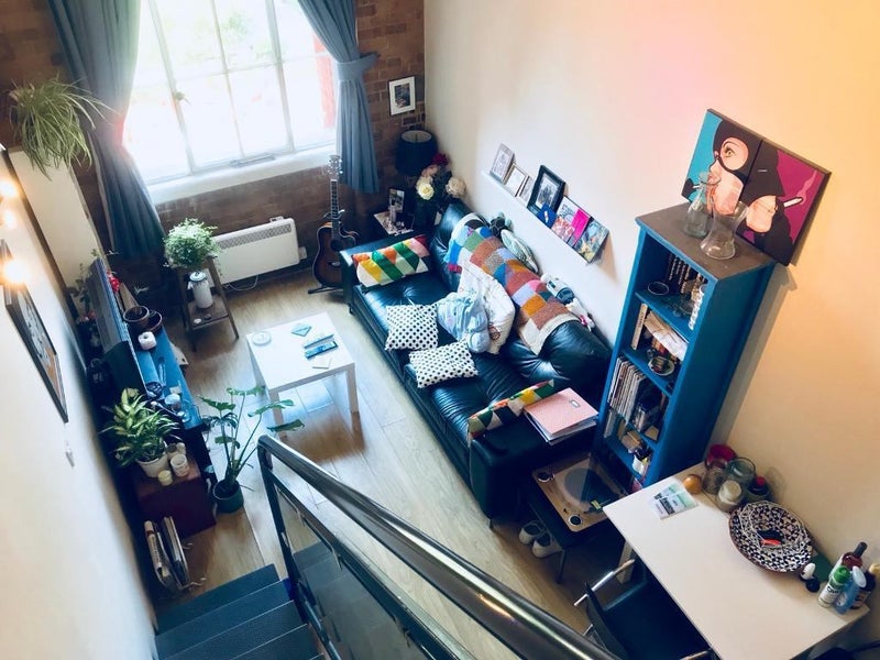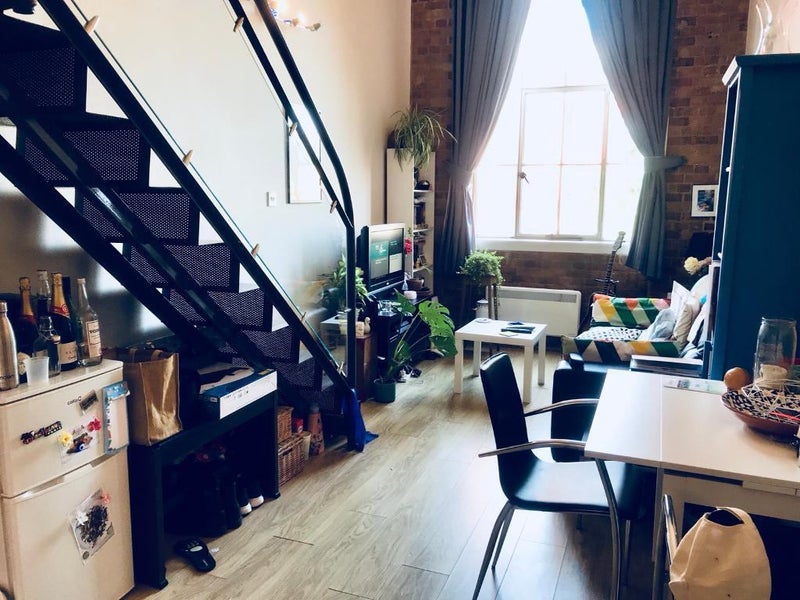 The living room benefits from double height ceilings and the exposed brickwork and huge window that makes the flats in this 1800s matchstick factory completely unique. The loft-style conversion features modern fittings in both the kitchen and bathroom.