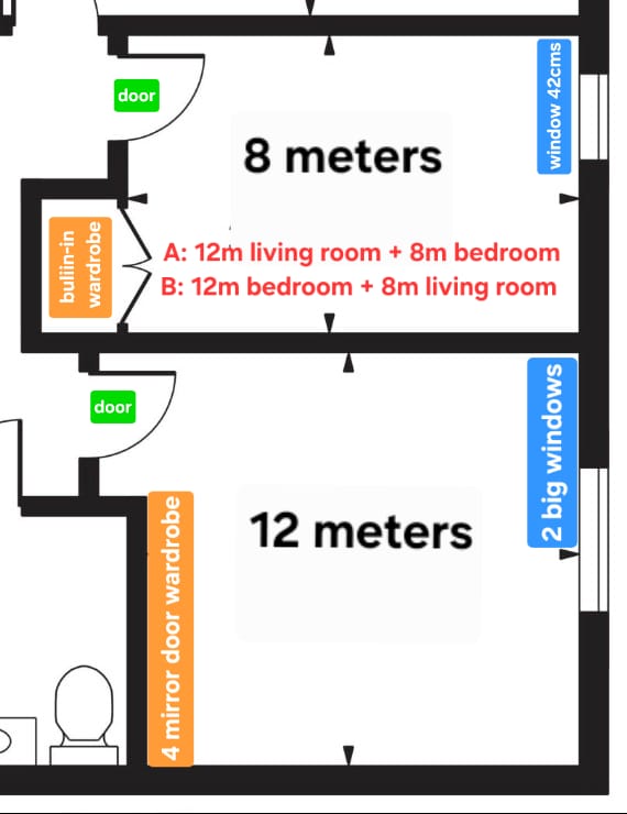 🔷 Space 1: 12m² (3.80 x 3.23m) - Panoramic double windows (loads of natural light!)