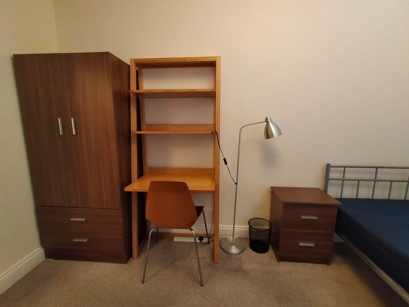 The room is fully furnished with a single bed, a wardrobe, and a desk&chair set. Shared toilet and kitchen. Hot water, central heating, and unlimited high-speed internet are available. Bills are included except council tax and TV licensing.