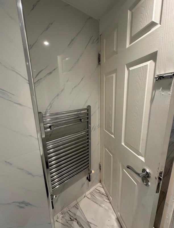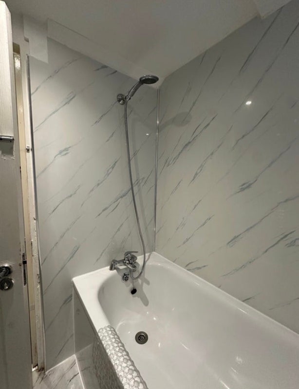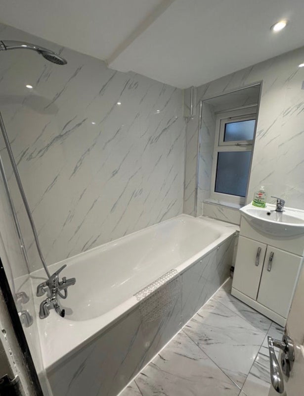 • Luxury Bathroom: Stunning marble-effect tiling throughout, featuring a full-sized bath with a sleek chrome rainfall shower.