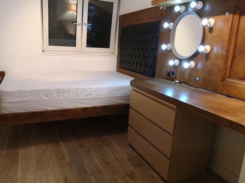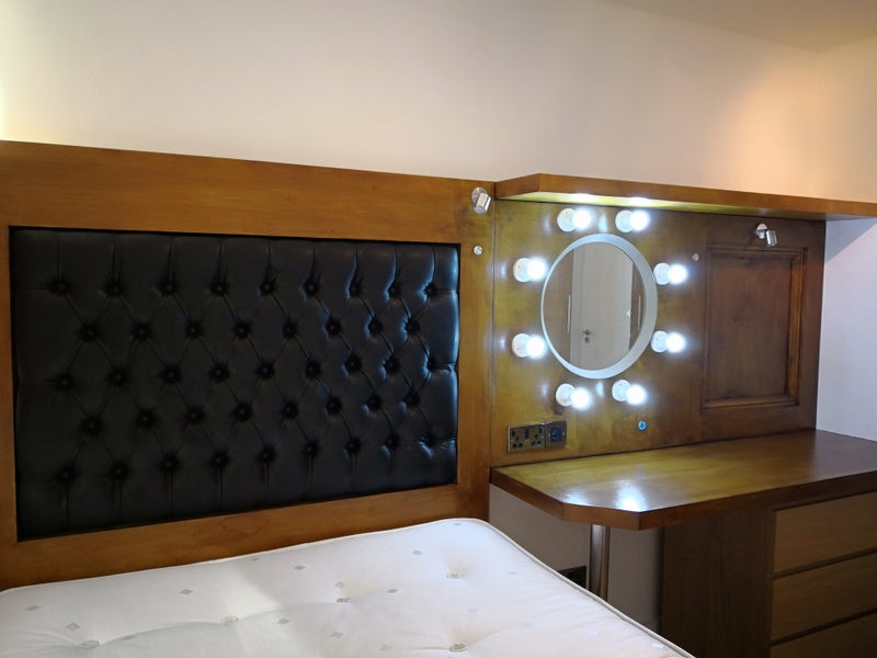 Bedroom 2 is an even larger double bedroom with triple wardrobe, beautiful built-in panelled desk and headboard with built-in reading lights, and a dressing table with illuminated mirror.