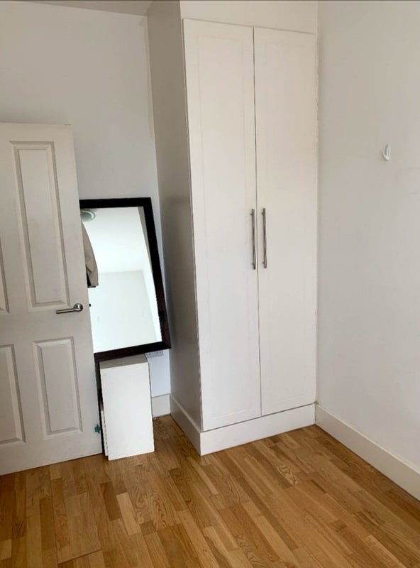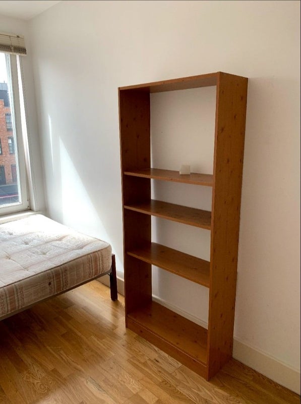 The room comes with a double bed, a small chest of drawers, a bookcase and a built-in wardrobe. There is space for a desk if you will be working from home.