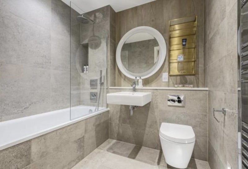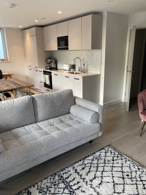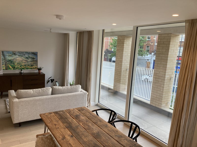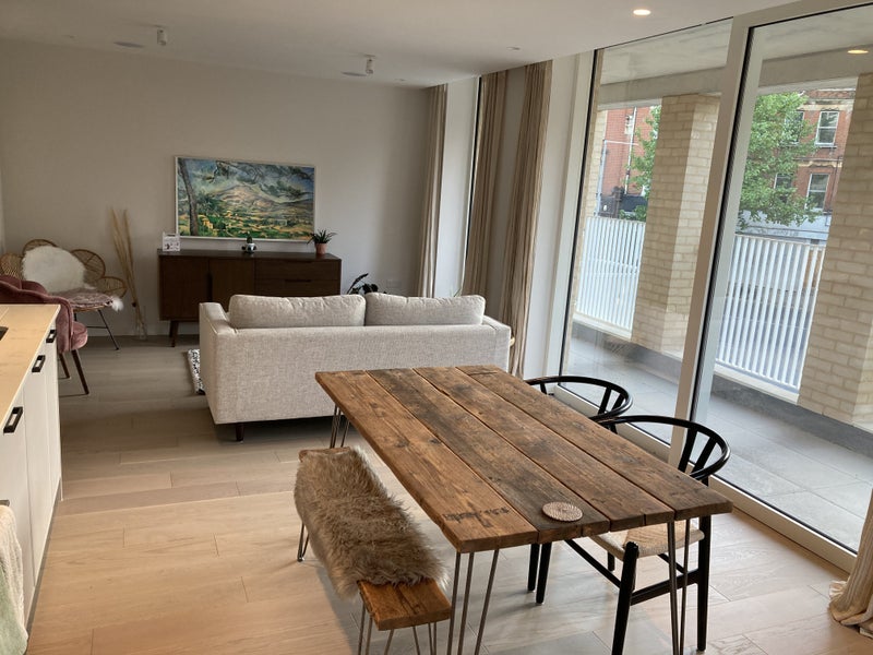 The flat has two bathrooms, both with a shower and bath. There is a spacious, bright open-plan kitchen-living room that opens out onto a large balcony. There is also a communal garden, and the building has a secure bike store. The flat is 'smart' with underfloor heating, lighting and a Sonos sound system in the ceilings, controllable by an app!
