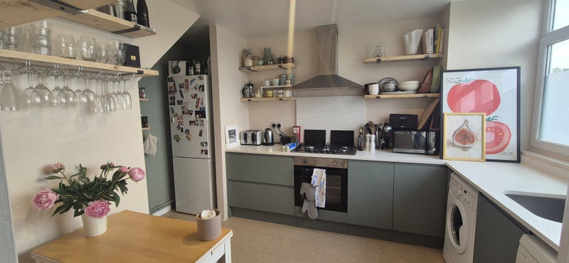 The flat has been entirely renovated and has an eat in kitchen with 5 burner gas hob, electric oven, dishwasher, all crockery, lots of pots and pans etc (I like to cook) and separate living room with loads of natural light. I also have a south facing balcony. :)