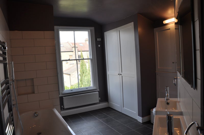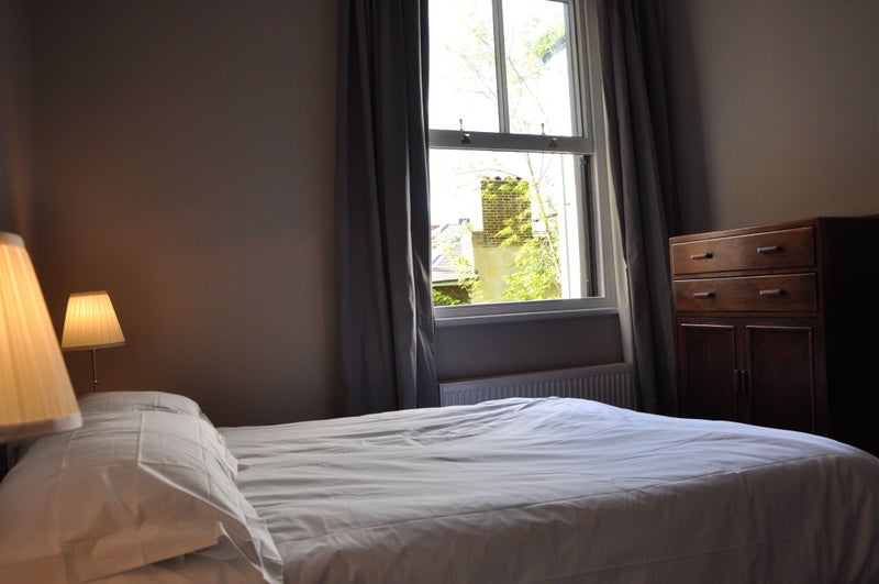 A peaceful, light-filled second floor double bedroom with views over the back garden. The room is furnished with a kingsize bed, desk and chair and beautiful chest of drawers, making it ideal for both comfortable living and home working. For single occupancy only.