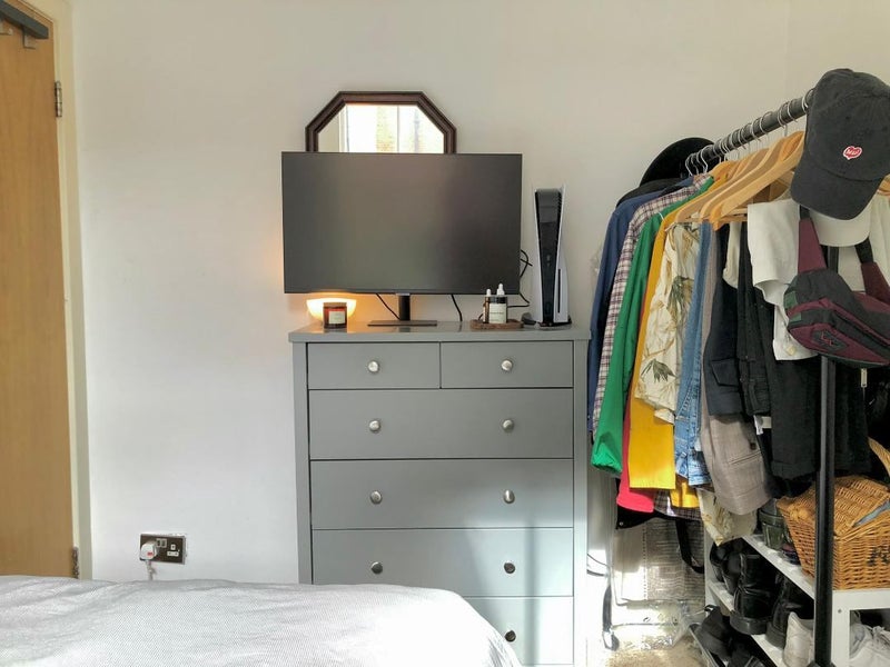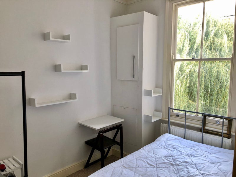 The room is a small/medium sized double with a large window, there is a clothes rail/ shoe rack and a chest of drawers, a fold down study table with chair, bedside shelf, and plenty of extra storage under the queen size double bed.