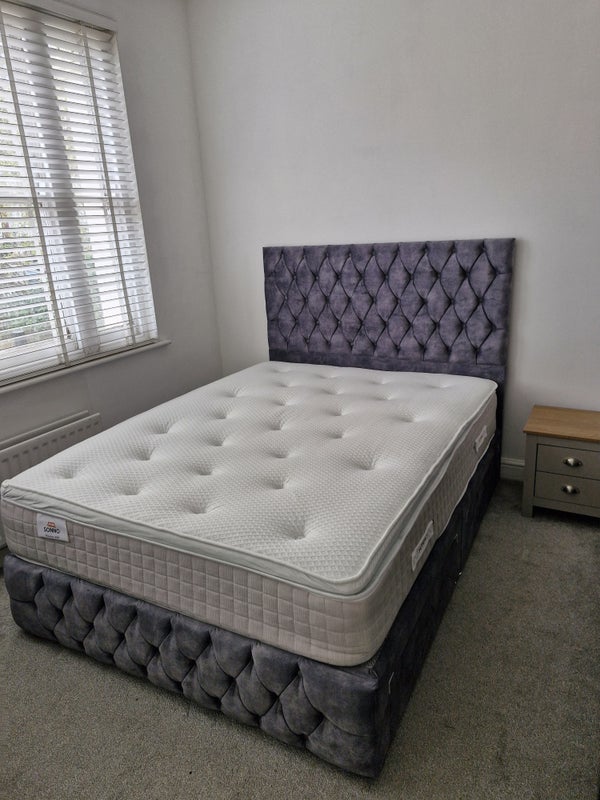 Fully furnished room with bed, desk with gaming chair and bed side table